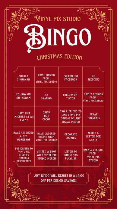 It is a new way to earn $5.00 off of a design, in multiples even! Simply complete a BINGO and receive $5.00 off of a design at an event, off of a SIY Workshop fee, or even online when ordering! You can get more than one BINGO while the game is active, which it ends at midnight on December 6th, 2025. Let's have fun with this!!